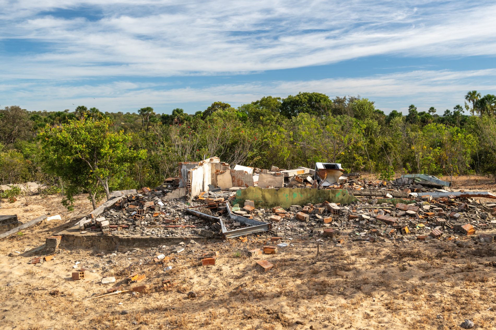 Deixamos a área do complexo de propriedades Condomínio Cachoeira do Estrondo, ao passar por uma porteira vigiada pela empresa por câmera. A paisagem se transforma tão logo adentramos o Vale do Rio Preto. Aqui, onde o Cerrado resiste, comunidades geraizeiras vivem desde o século 19 de práticas tradicionais nos vales e chapadas, baseadas em agricultura familiar, extrativismo de frutos silvestres, pesca e pecuária de pequena escala. Esses modos de vida estão atrelados à preservação do gerais, como é chamada aqui a área de cerrado, um dos 11 tipos de vegetação do bioma, marcado por árvores baixas e arbustos e, ao longo dos cursos de água, veredas repletas de buritis e gramíneas.